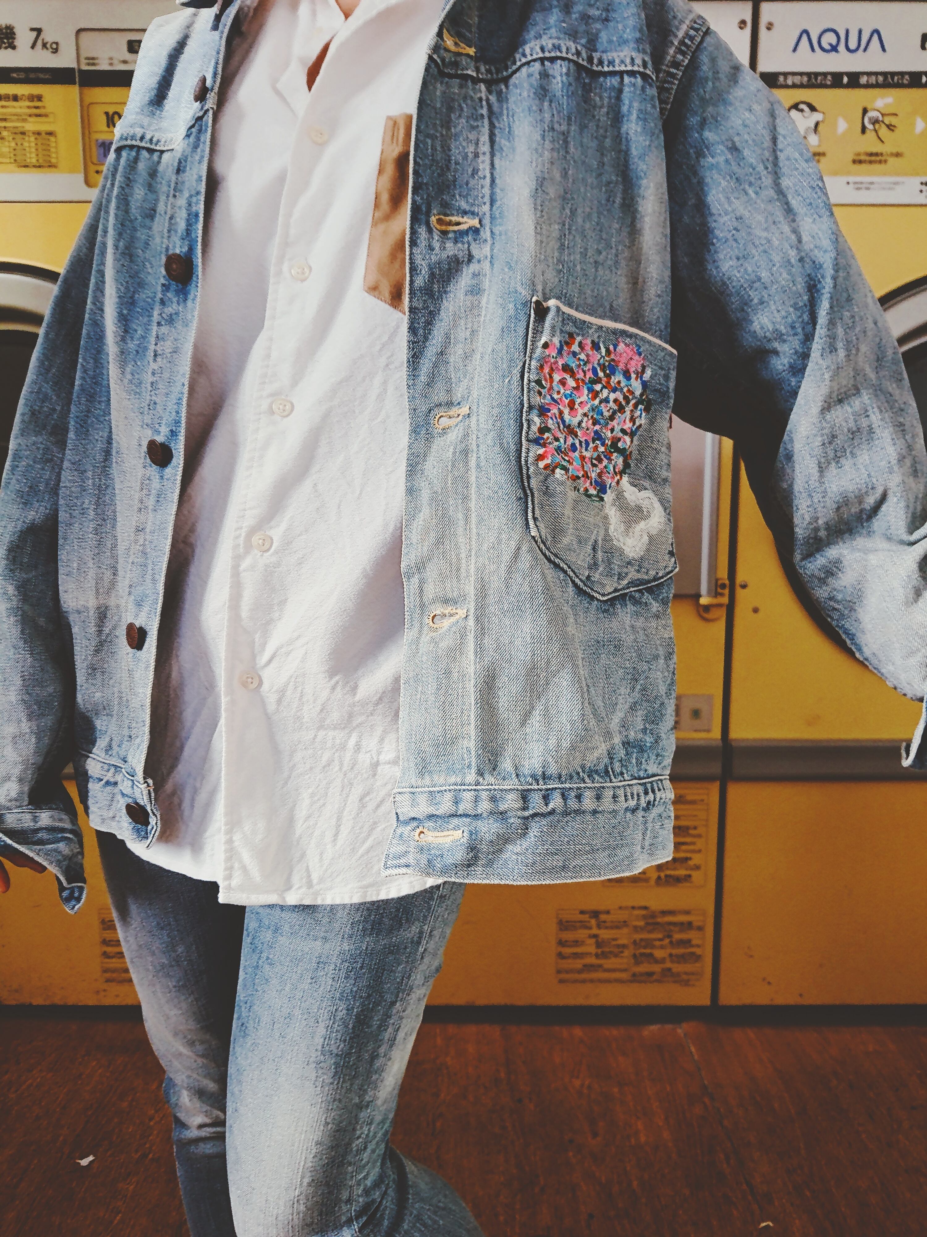 デニムジャケットの裏に布絵の具でパグと花を描きました(*^^*)フロントには花束が描かれています(^-^)